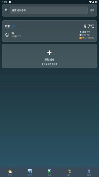 在城市页面,我们可以快速添加多个城市的位置信息,出差更换城市时能实现秒速切换。