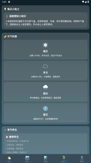 在小贴士页面,大家也能看到天气科普内容,持续阅读,积累更多气象知识。