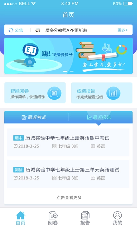 3、爱多分教师端最新版本支持即点即看学生试卷情况。系统会为您推送最近考试、最近报告两个板块。