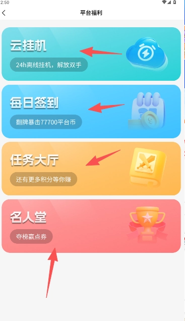 3、平台福利:涵盖云挂机、每日签到、任务大厅和名人堂四个板块,用户可选择参与各板块内的活动,完成指定任务即可领取福利。