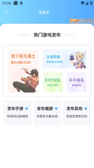 3、在“我要卖”页面,你可以挑选热门游戏进行发布,同时支持发布手游、端游以及其他类型的游戏。