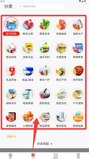 2、回到首页后,点击底部的“分类”栏,浏览各类商品分类,然后选择你感兴趣的分类入口进入。