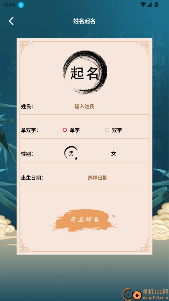 3. 输入姓氏时选择单字或双字形式,选定性别与日期后,点击“开启好名”按钮进入后续步骤
