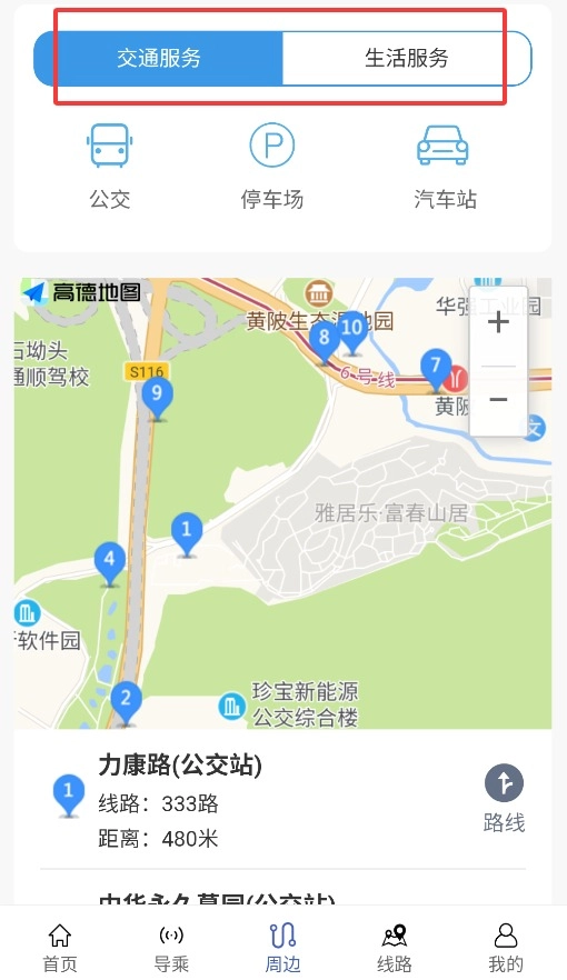 4、周边服务整合了交通及生活设施查询功能,能快速找到附近的便利店、加油站等场所。