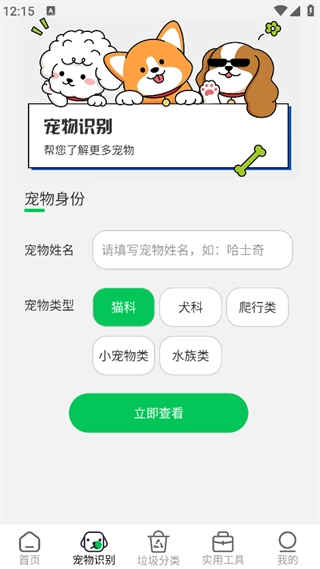3. 点击页面下方的“宠物识别”选项,就能依据宠物的姓名和类型来完成宠物识别操作。