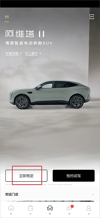 1、打开阿维塔汽车,在车界面中点击立即预定