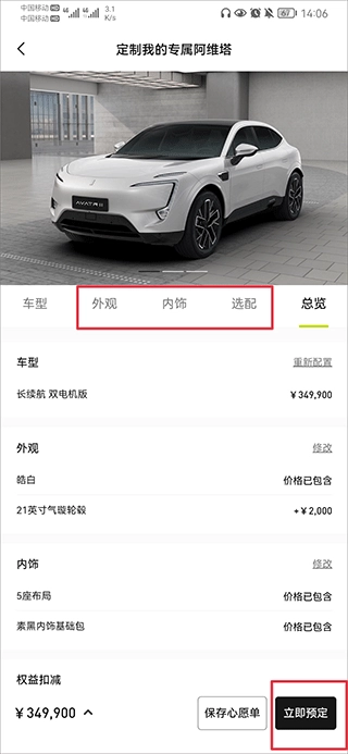 3、接着把外观颜色、轮胎、内饰、配置等选项挑选完毕后,点击立即预订