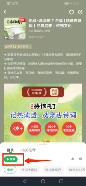 4、挑选诗词合集点击播放,即可收听音频。