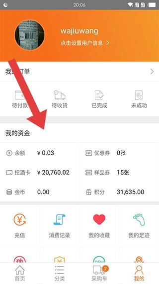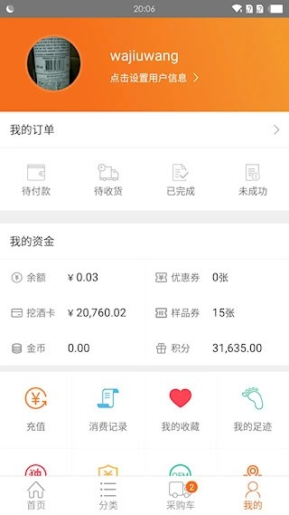 3、个人中心提供资料编辑功能,各状态订单标签排列清晰,账户余额、预付卡及积分金币资产设有独立展示版块,同时支持资金流水与消费明细的查询服务。