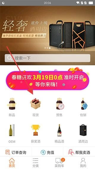 1、主界面顶部配备搜索框与轻奢酒具推广区域,中间位置重点展示春季糖酒会专题活动,并整合了新品速递、现货专区、订单管理、账户充值等核心功能入口。