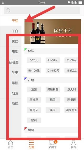 2、分类页对葡萄酒类型进行了系统划分,像干红葡萄酒这类都有明确归类;进入分类页后,能借助价格区间、原产国家、葡萄品种等条件组合筛选商品,可覆盖不同档次与产地的葡萄酒。