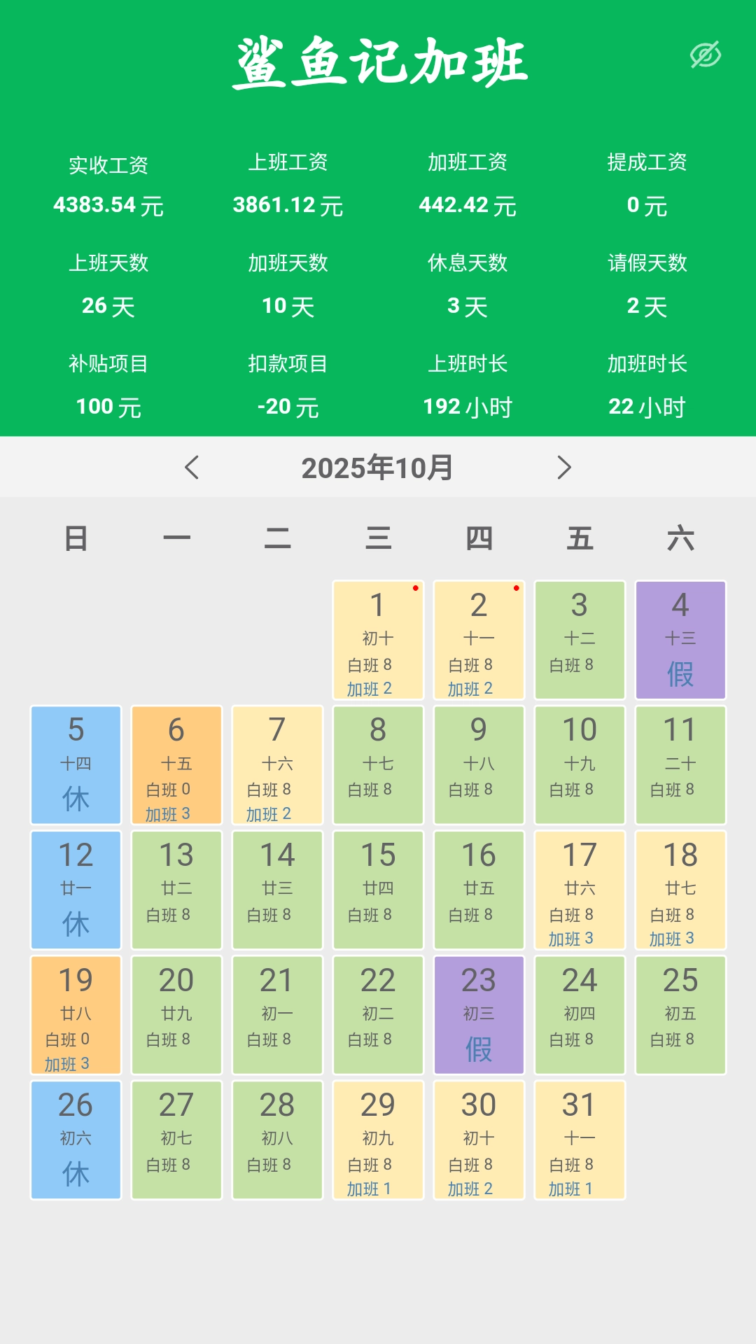 鲨鱼记加班软件是一款聚焦工资计算与考勤管理的工具,具备多种工种工资计算方式和详尽的考勤统计功能,可适配标准工种、小时工种、底薪加提成等各类薪资计算模式,能满足不同岗位的薪资核算要求,直观展示工资构成与考勤数据。