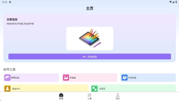 1、进入应用后,主页呈现出创意画板、创作工具等功能模块,方便我们快速开启绘画体验。