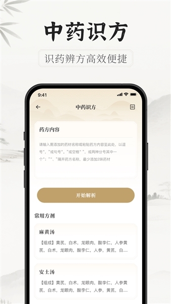 2、整合权威经典药方资源,协助您辨识处方单中的药材信息,同时为您呈现药方的出处、功效、用法、禁忌及方解等内容,助力您更安心地用药。