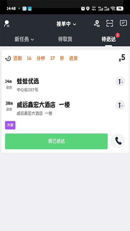 平台的任务状态包含新任务、待取货、待送达等类别,配送员可清楚了解每单外卖当前所处的阶段。