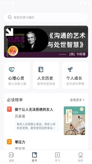 平台设有心理心灵、人文历史、个人成长等板块,还包含必读榜单,为用户提供丰富多元的心灵成长相关素材。