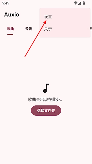 1、启动Auxio播放器,点击界面右上角的三点图标,在弹出的菜单中选择“设置”选项