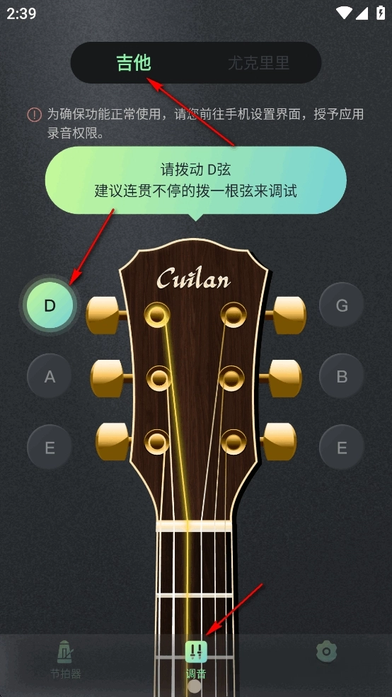 点击【调音】按钮,接着点击【吉他】选项,然后分别选择D弦等每一根弦来进行调音操作。