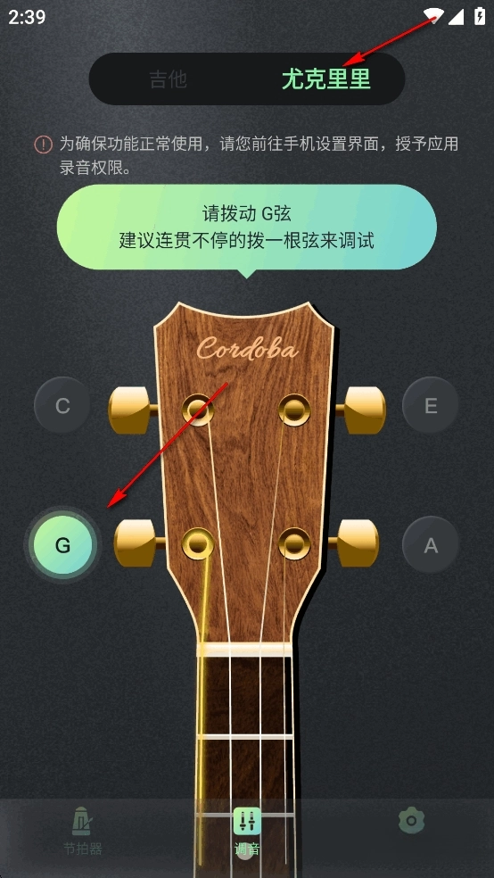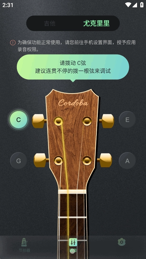《免费吉他调音》是一款专门为吉他练习者设计的调音器应用,它包含节拍器与调音两大功能模块。用户可通过节拍器功能调整音色和速度,借助调音模块为吉他及尤克里里校准音高,既能用它来修正吉他的音准问题,也能辅助练习吉他演奏的节奏感。