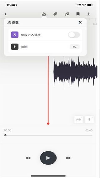 2. 软件会把它转化成一个工程项目,在播放控制页面可以看到对应的波形。点击最上方的按钮,就能查看并使用倒数启动播放、拍速调节功能,还能设置小节的循环播放。