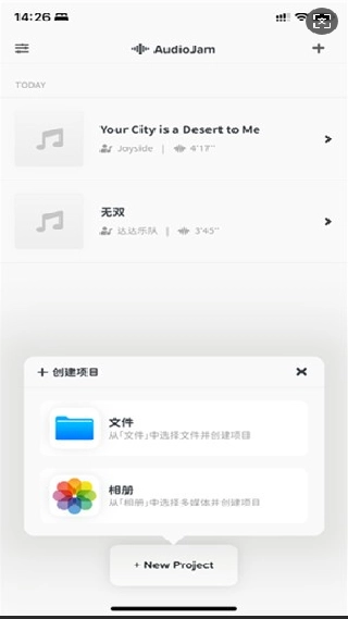 1. 打开AudioJam软件,点击界面底部的“+”按钮,随后选择文件或相册选项,上传需要提取音乐的视频文件。