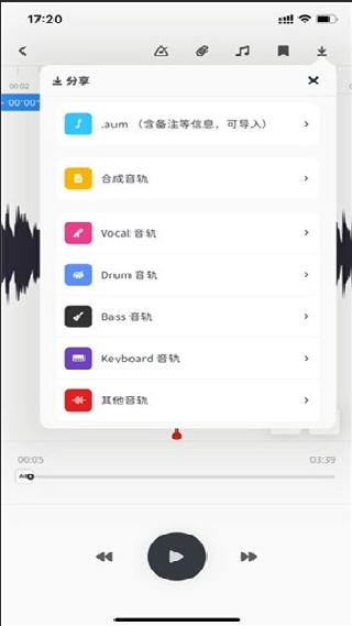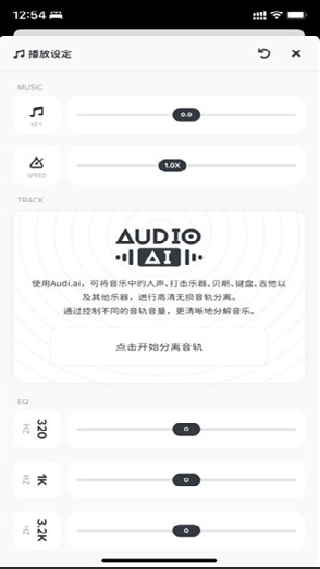 4. 若要分离当前音乐,可点击右上方的播放设置功能,接着点击TRACK中的AUDIOAI功能。音频文件会被传输至云端进行分析,之后生成的多个音轨将被保存至本地,以此完成音轨分离操作。