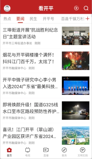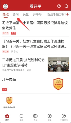 2、在首页导航栏找到“开平要闻”栏目并点击进入,即可浏览本地最新的时事动态与政策解读内容。