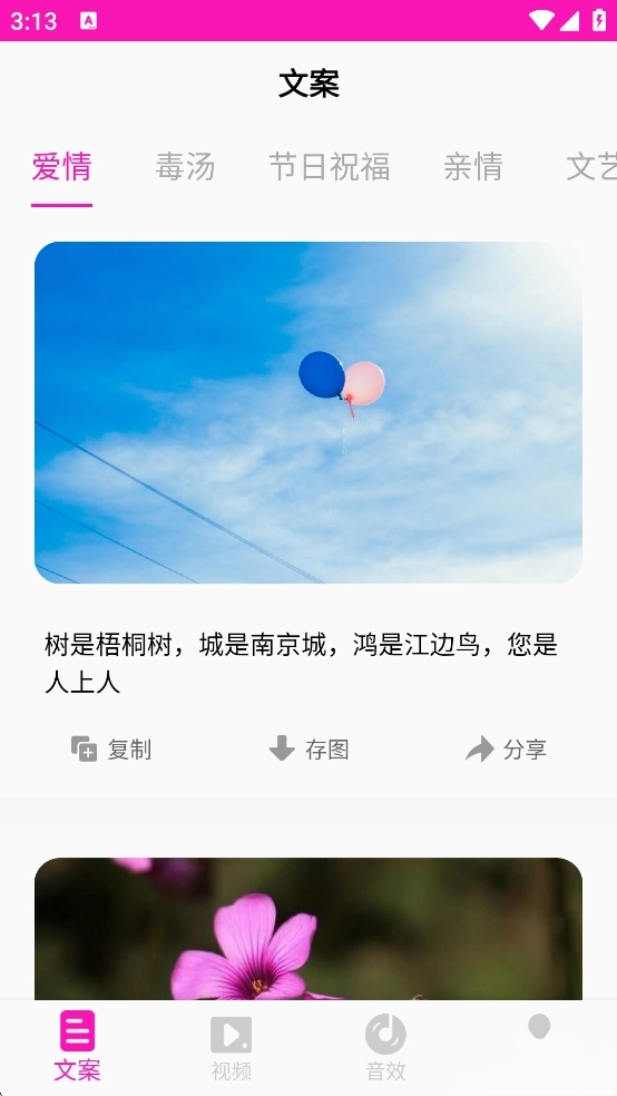 素材库是一款为用户提供素材的工具,在这里您可以复制文字、图片等素材,用于朋友圈、个人状态、个人说说等场景的文案创作,快来使用吧。