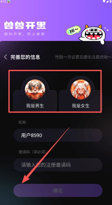 2、完善个人信息,补充性别等资料,可选择填写邀请码后进入。
