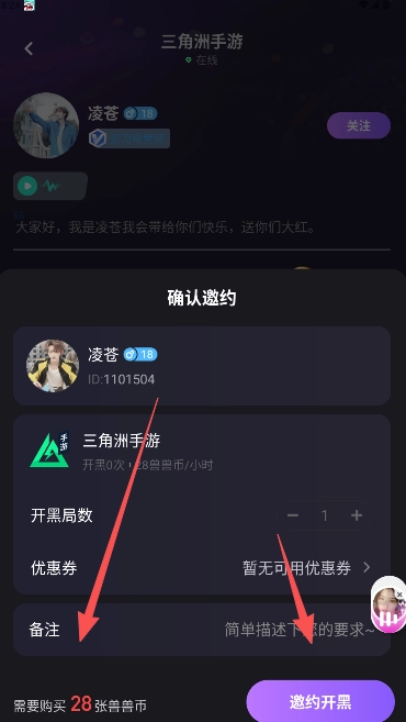 4、开黑就请支付兽兽币下单,邀约开黑。