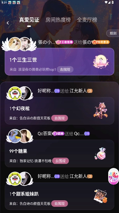 1、当单次赠送礼物的金额达到或超过200钻石时,相关记录就会显示在真爱列表中