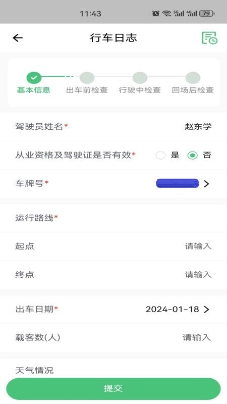 4、开展行车日志编辑工作,录入驾驶员及出行基本信息后即可提交上报;