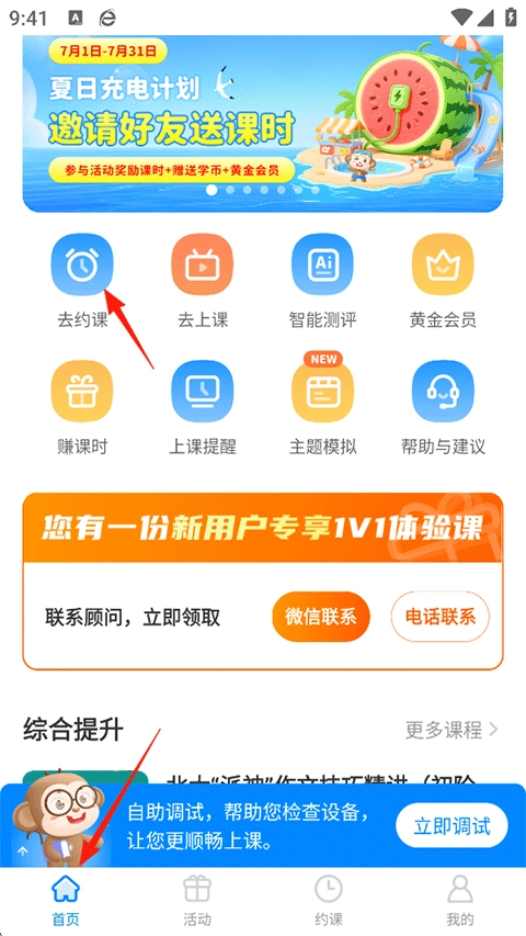 1、点击进入软件,里面提供去约课、去上课、智能测评、客服中心等等,选择去约课;