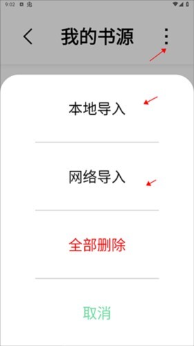 2、然后系统会自带部分的书源,如果觉得这些不够的话可以点击右上角,里面支持本地导入和网络导入