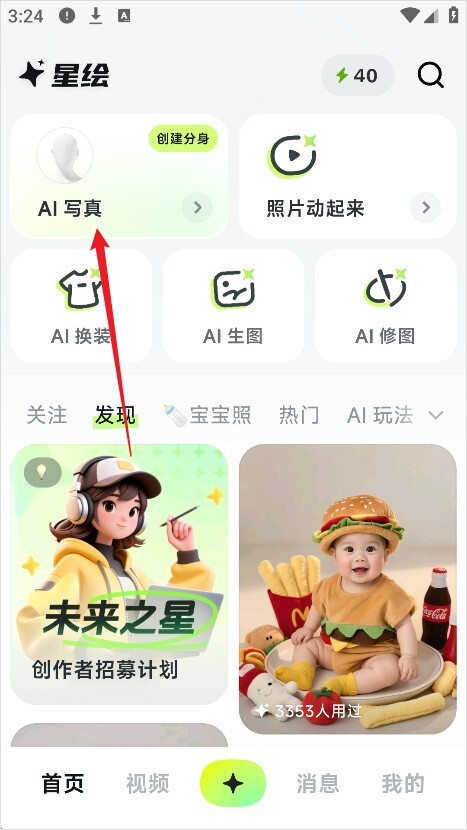 1、启动星绘App,进入主界面后,点击【AI写真】的功能入口。