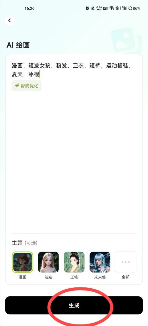 3、接着输入契合该画风的关键词,描述越详尽生成的效果会越佳,点击“生成”按钮就能完成操作。