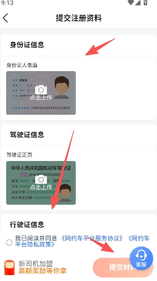 5、在提交注册资料页面,完成证件的上传操作点击提交,完成加盟。