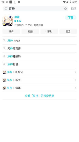 2、点击首页右上角的搜索图标,输入游戏名称(如"原神"),即可显示该游戏的详细信息。