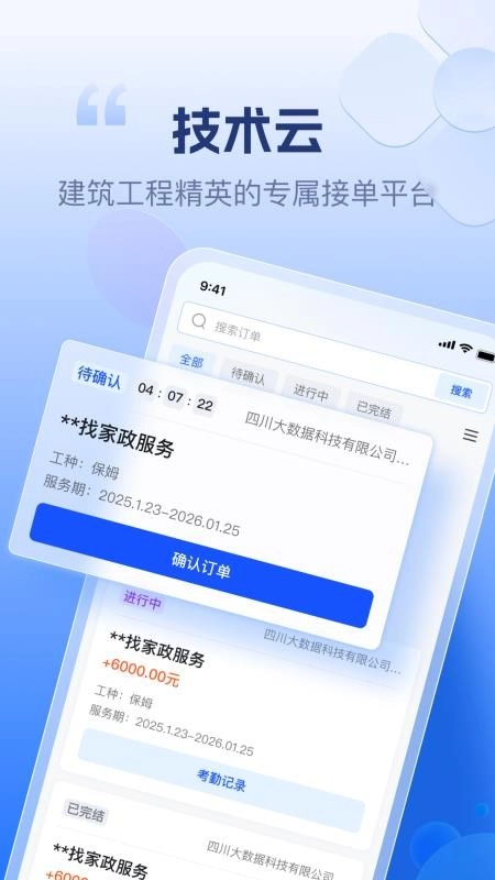 技术云是专为建筑工人开发的移动接单工具,致力于优化日常找单接单流程。平台每日推送大量订单资源,用户可实时关注,遇到合适的服务订单能直接在线确认承接,及时为客户提供专业服务,实现技能变现;所有订单信息详实且经过严格审核,确保真实可靠,充分满足接单需求;个人工单信息清晰呈现,接单数据与收益金额一目了然,便于用户分析并优化接单策略,提升接单效率;有需求的师傅欢迎使用技术云软件,助力接单更轻松便捷。