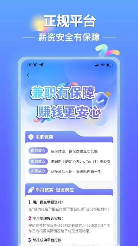 这是一个正规的兼职平台,所有岗位都经过了严格的筛选和审核,能为用户提供可靠的保障,让大家可以安心挑选合适的兼职工作。
