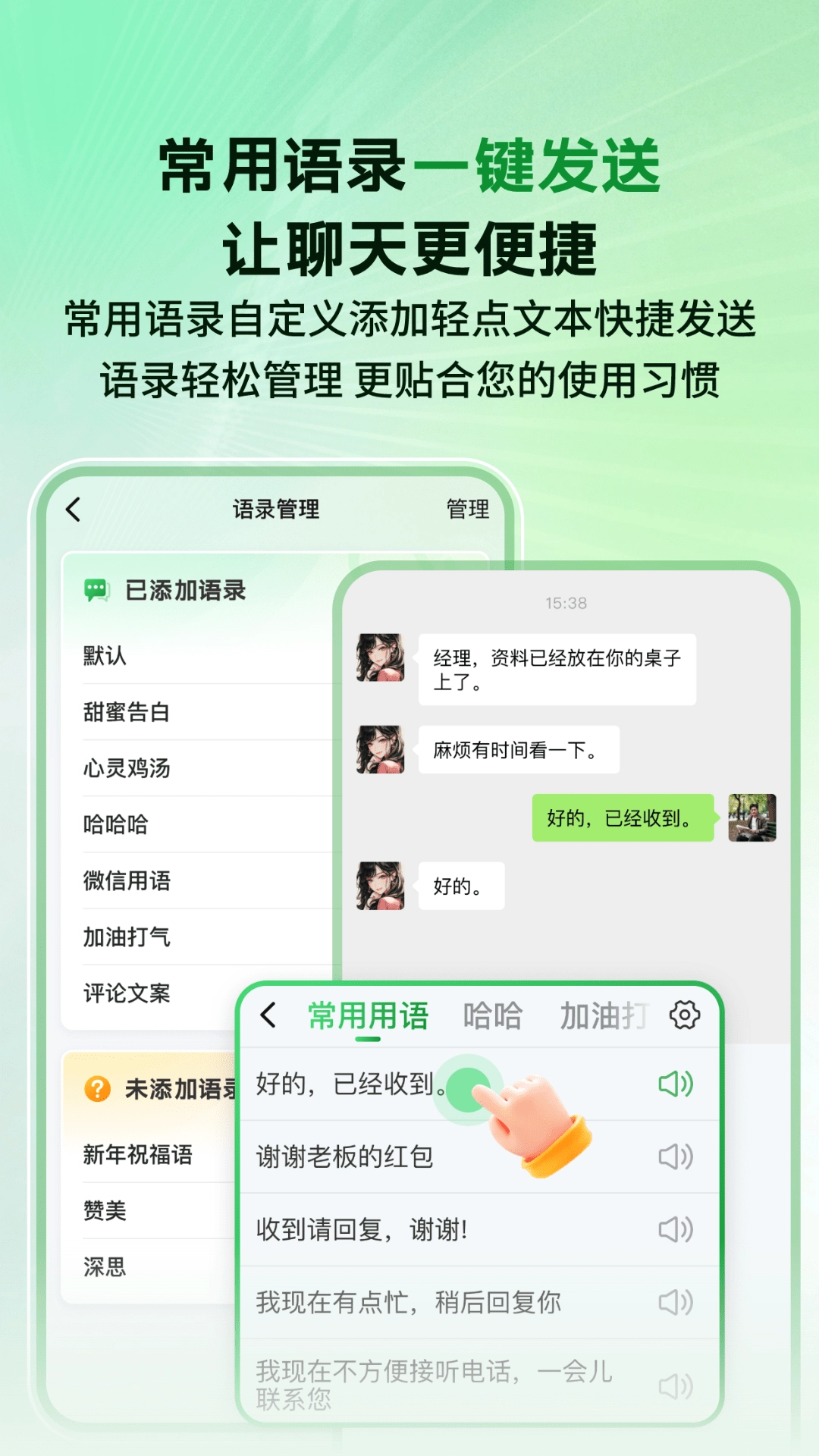 - 专属语录设置:可以提前设置好专属于自己的常用语录,常用语录一键发送让聊天更便捷,还可以进行一键添加删除等。