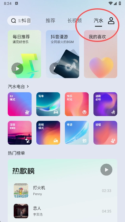1、用户可以来到汽水这个版区,可以看到热歌榜单