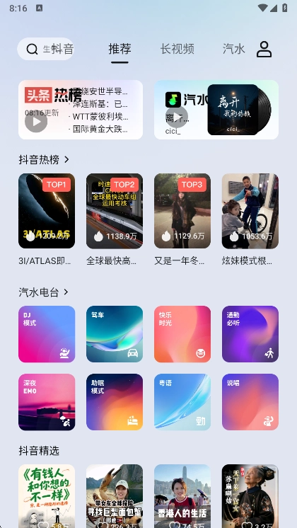 音频内容包含头条音频、听抖音、抖音音乐等板块,并且已接入汽水音乐平台,拥有超千万首歌曲的曲库资源,音乐风格覆盖流行、嘻哈、电音、摇滚、国风等多种品类。