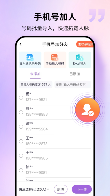 3、具备自动批量添加功能,可导入手机号批量添加通讯录好友、自动添加群成员。