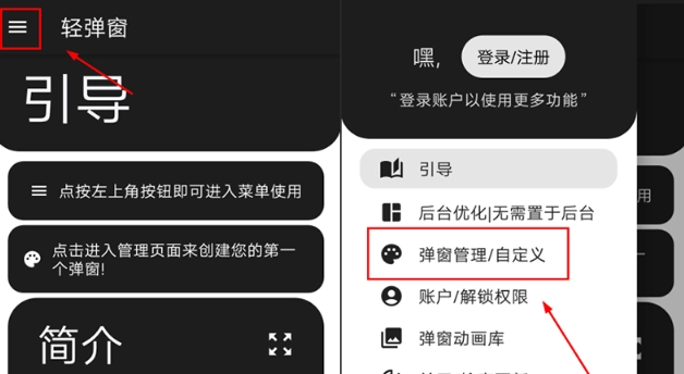 打开轻弹窗后,点击首页左上角的三条横线图标,此时会弹出菜单栏,接着选择“弹窗管理/自定义”选项,即可对弹窗进行个性化的自定义设置。