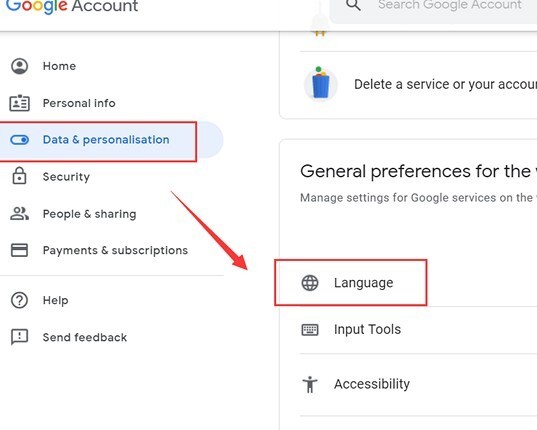 2、进入跳转后的谷歌账号界面,点击左侧的data选项,接着选择language选项。