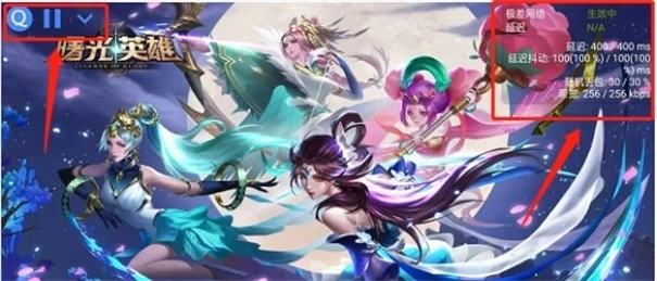 8、启动后将直接进入选定的应用,界面会显示网络环境数据的悬浮窗,可随时选择暂停或开始,右侧会实时呈现网络环境数据。