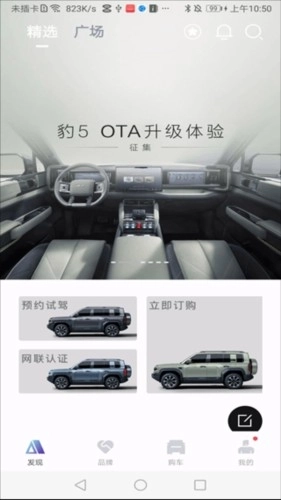 1、进入软件首页后,既能预约试驾或新车,也可进行网联认证。