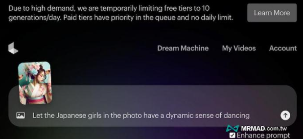 3、在输入指令框中直接上传图片,Luma AI会根据照片中的人物或场景自动生成更多动态影格画面。
