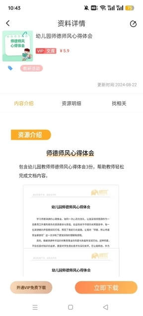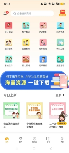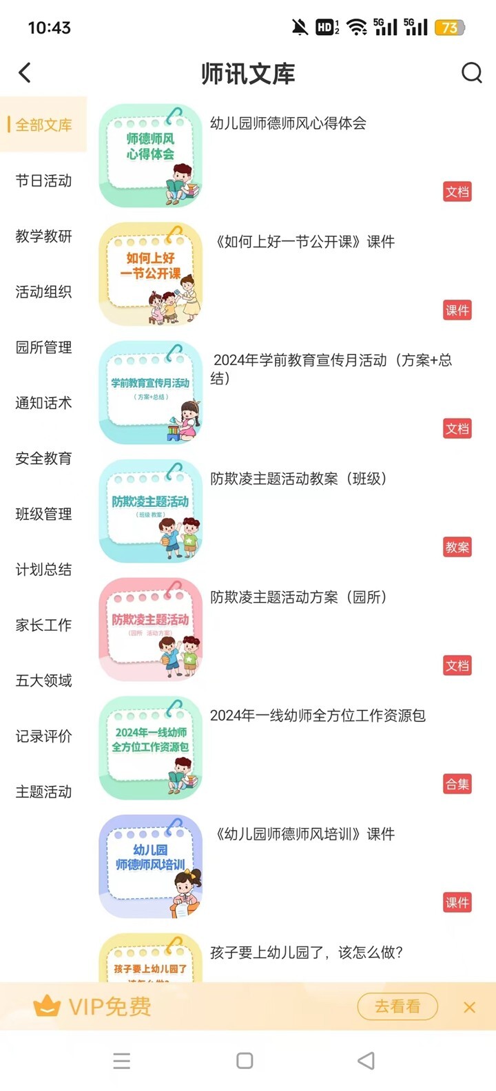 设计、教学材料、环创方案、宣传海报、课件制作等各类工作所需的参考资料与教学案例,覆盖园所管理、班级运营、教育教学、家园沟通等实际工作场景,助力提升工作效率。平台不仅实时更新幼教资源,还配备导师团队快速响应需求,社群内更有丰富实用的经验交流;此外,每日行业资讯、主题论坛活动、知识变现渠道以及教材教具资源等,全方位帮助老师提升专业技能、节省时间成本与经济支出,实现高效备课与教学,增强职业幸福感。1、借助师讯幼教资源平台查看